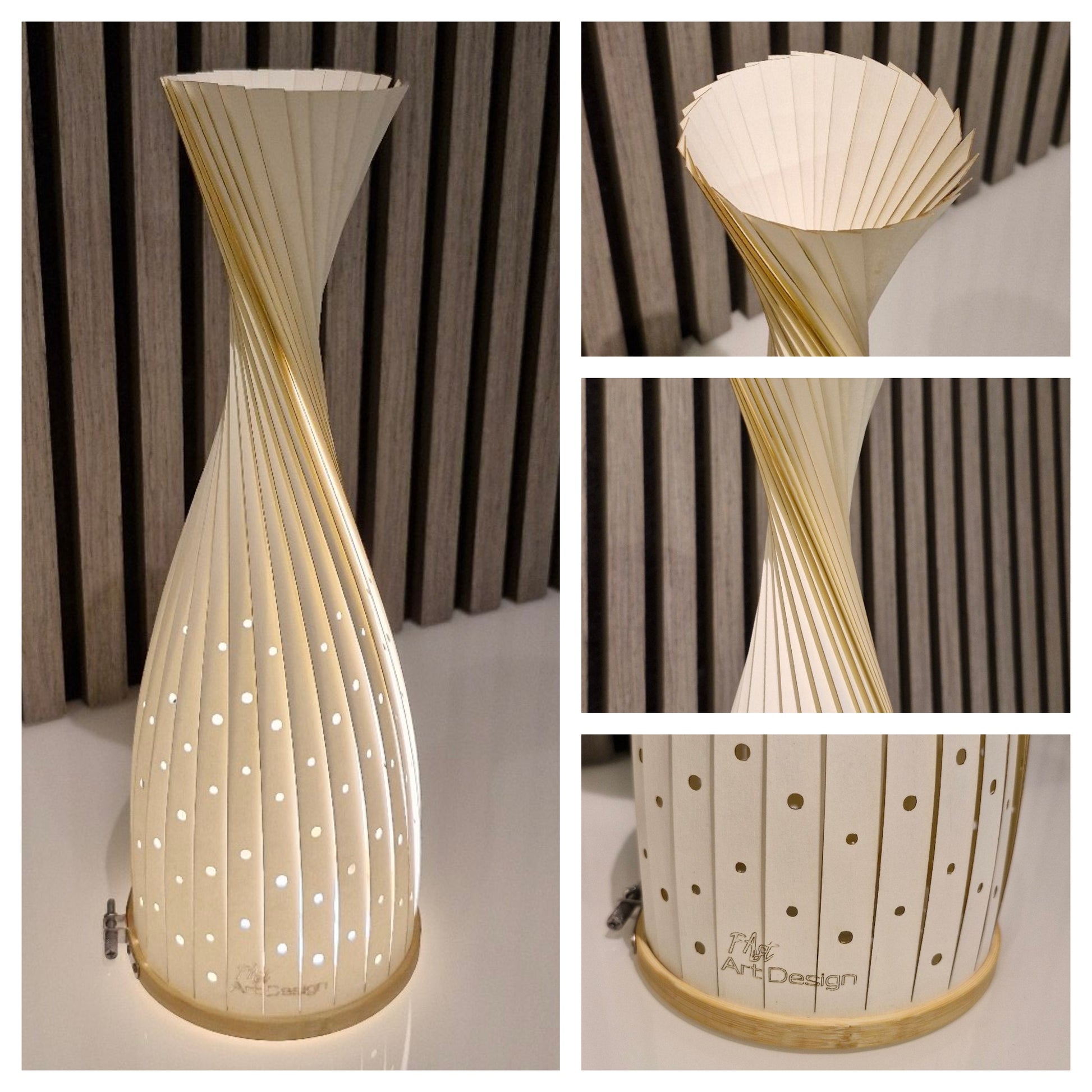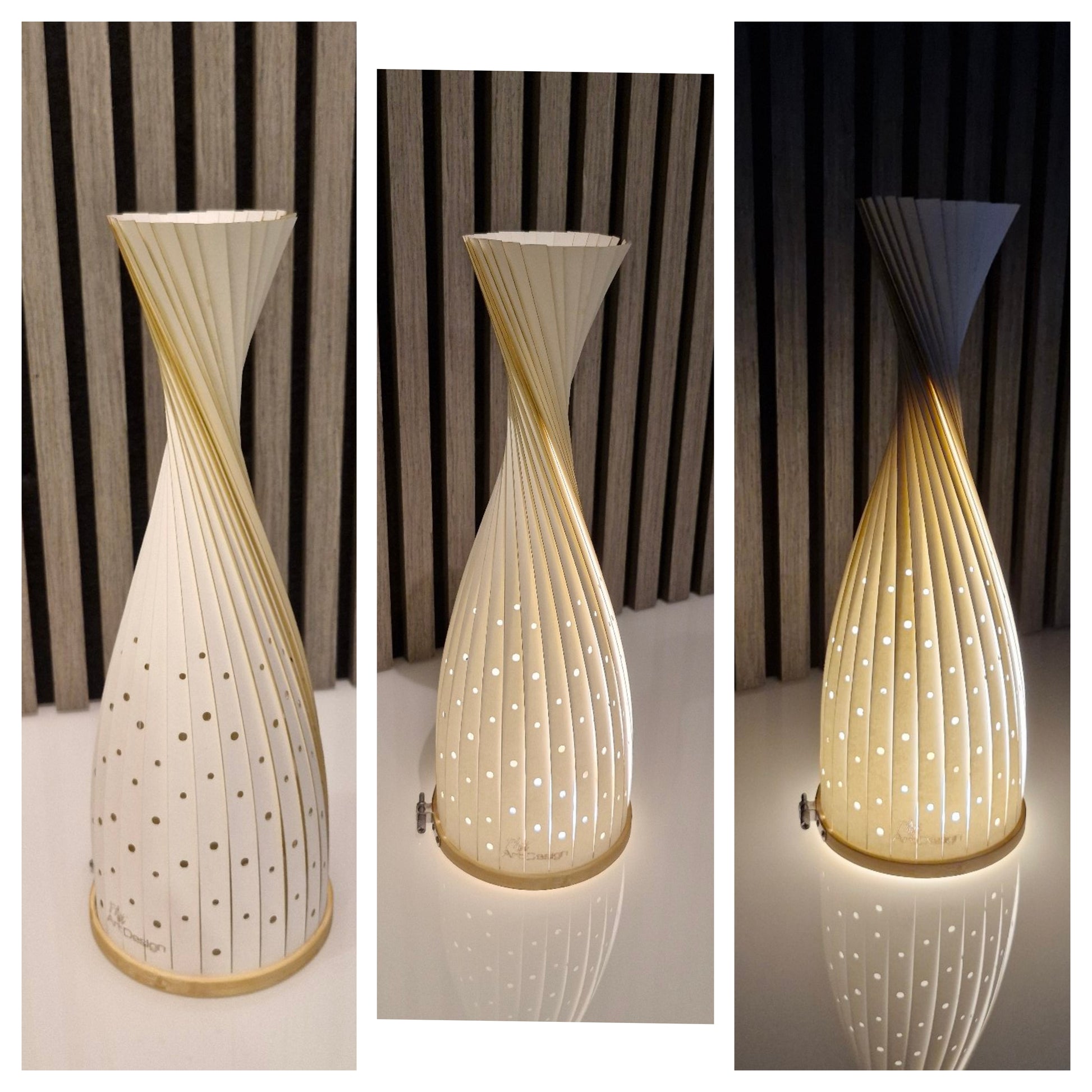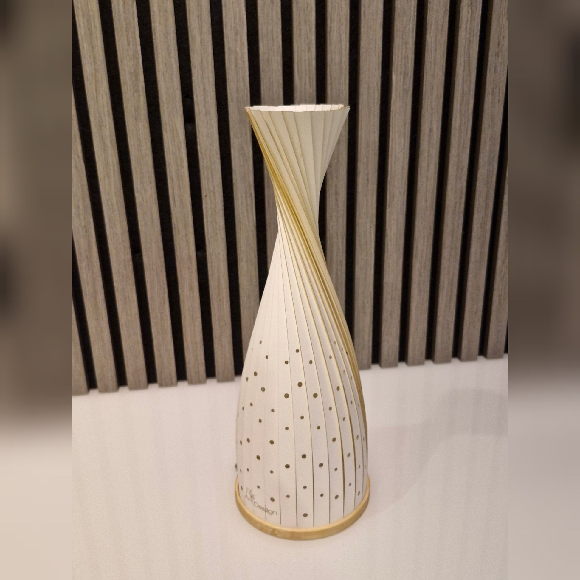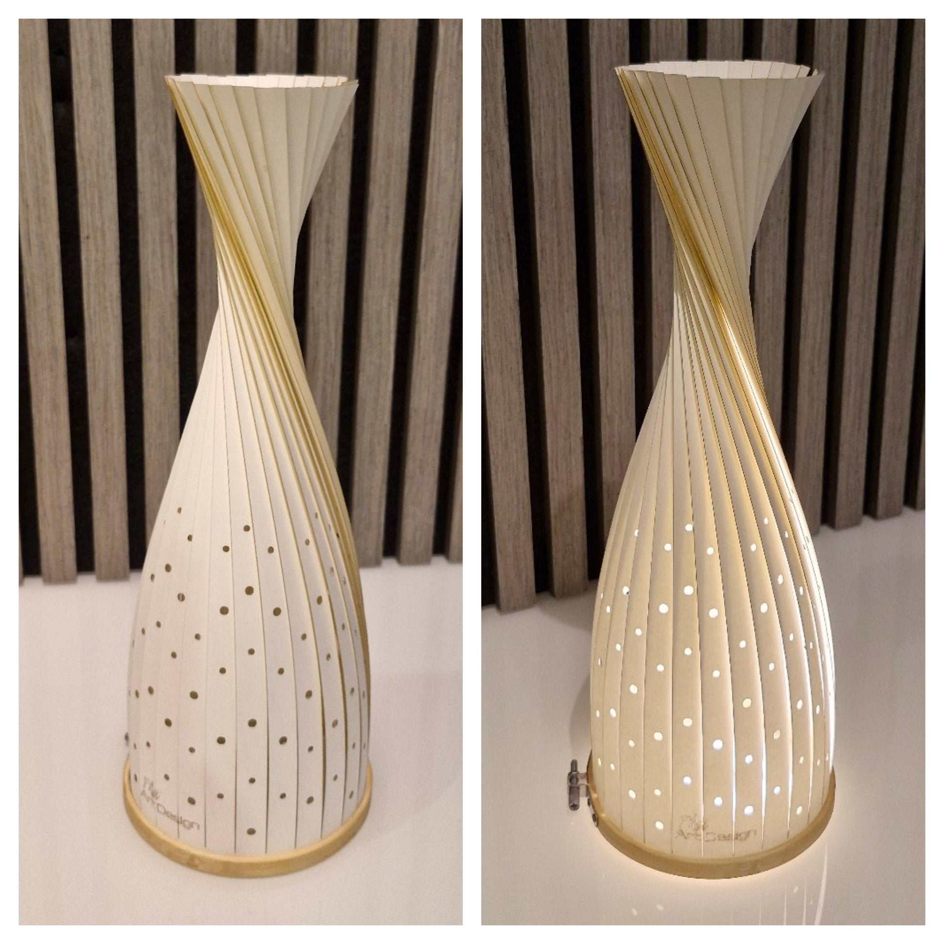 Formschönes Designobjekt / Lampe aus Design-Struktur-Papier (Natura), dezent aber immer ein Hingucker! Bei der „Natura“-Färbung hat das Papier eine dezente, natürliche, leicht gelbliche Färbung.